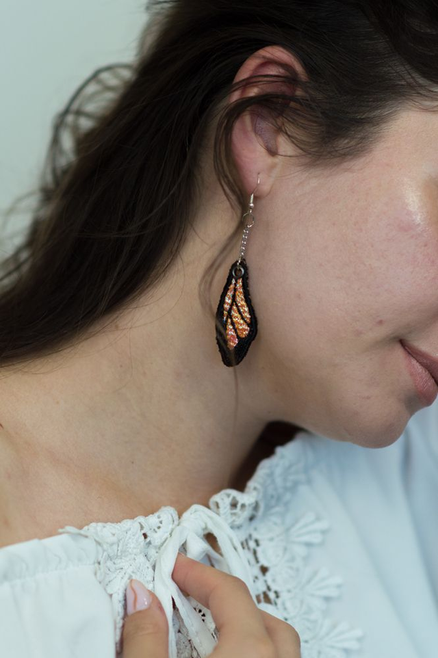 Paire de boucles d'oreilles brodées en forme d'ailes de papillon, avec une jolie couleur irisée.
