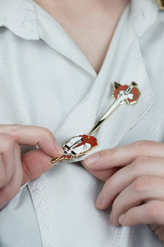 Un crâne fêlé décoré de roses rouges. Il peut être assorti à l'épée dont la pointe correspond à la fêlure du crâne :)