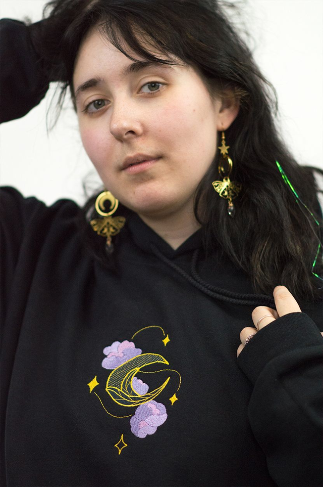 Broderies sur les poches, capuche, face et dos du sweat-shirt. Motifs célestes et floraux.