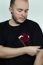 T-shirt noir 100% coton, brodé d'une faux et d'un cœur ensanglanté dans lequel il est écrit "Love you to death".