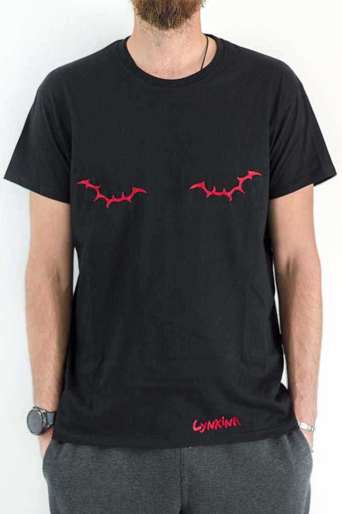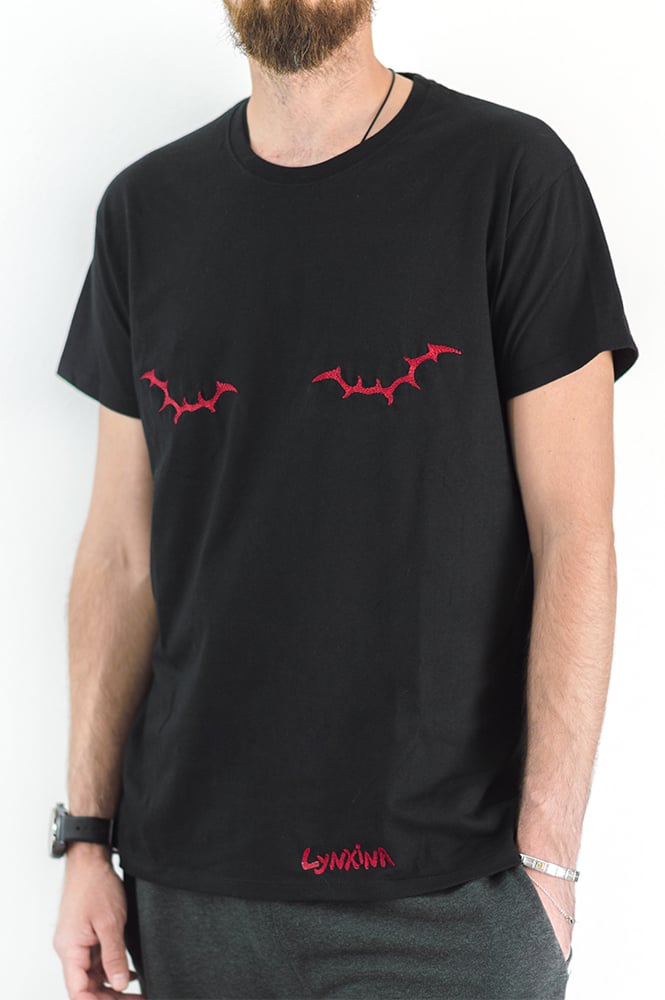 T-shirt noir 100% coton, brodé d'un motif rouge représentants des cicatrices stylisées et discrètes. Un message qui passe surtout auprès des personnes qui savent de quoi il s'agit ;)